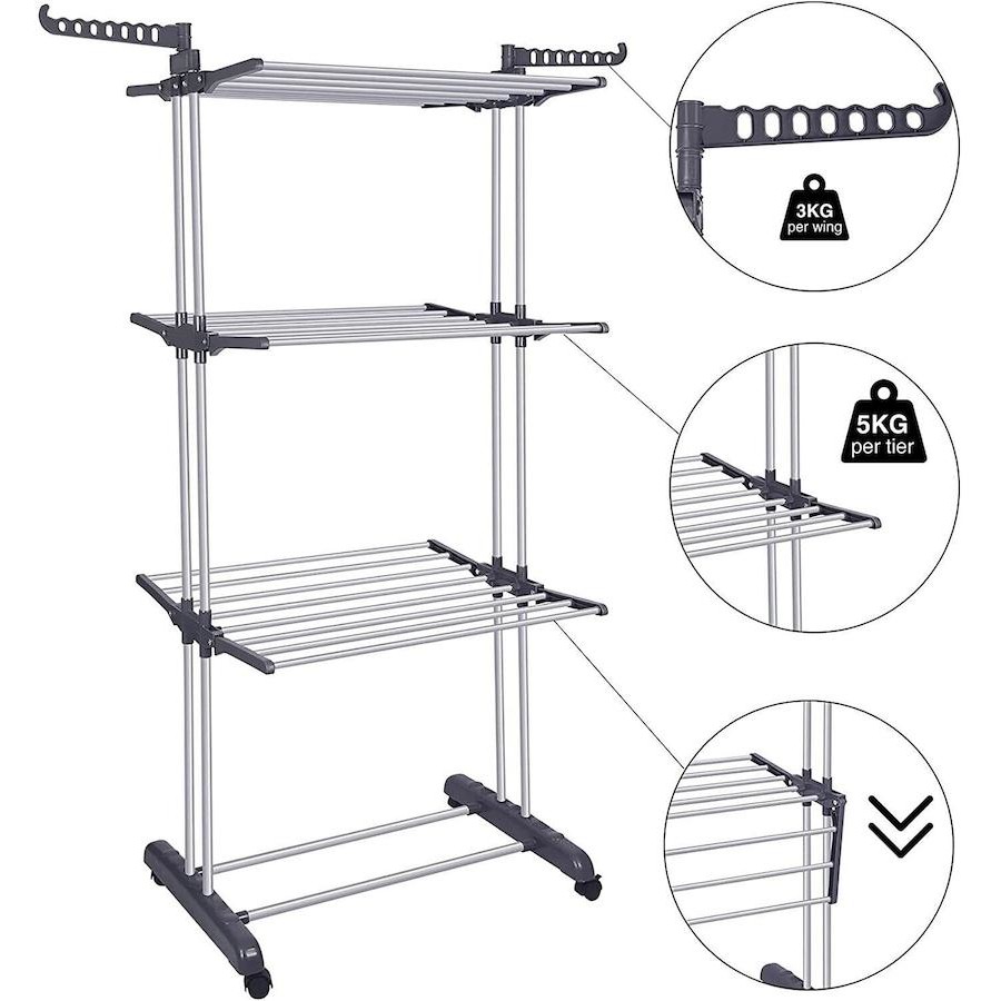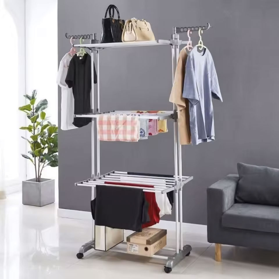 Mega Tender de tres niveles para aprovechar el espacio en tu hogar. Es excelente para acomodar toda tu ropa y que esté bien ordenada. Tiene rueditas y ademas para colgar con perchas.